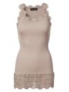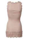 Lang silketop med blondekant forneden. Perfekt til hverdag under strik, luser eller cardigans. Str Medium ca 75 cm lang. 70 % silke 30 % bomuld.