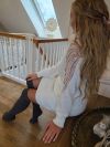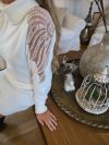 Vælg elegance med denne kjole i midilængde, prydet med forfinede detaljer, der yndefuldt falder fra skuldrene og ned langs ærmerne. Pynten tilføjer et subtilt og sofistikeret strejf af glamour, hvilket forvandler denne kjole til et uundværligt stykke. Dens midilængde flatterer figuren og er ideel til særlige lejligheder og formelle aftener. Fremstillet af et blødt og behageligt materiale, kombinerer denne kjole stil og finesse og giver et uforglemmeligt udseende til dem, der ønsker at stråle med elegance.